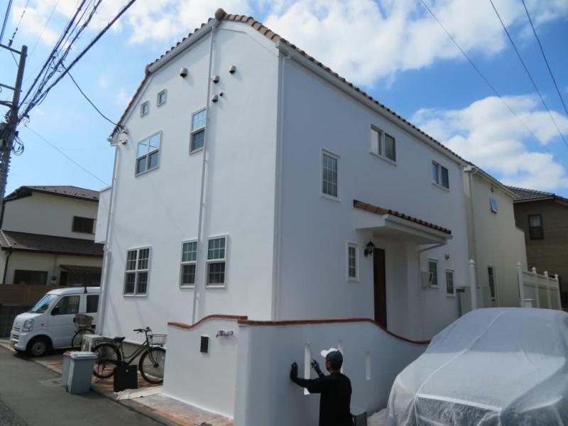 神奈川県横浜市 外壁:モルタル 屋根:コロニアル 今回、外壁は白を基調にしたツートンで、屋根は鮮やかな青色で施工となりました。外壁は超高耐久遮熱フッ素樹脂塗料、屋根も超高耐久フッ素樹脂塗料での施工です。外壁、屋根共にメーカー保証です。