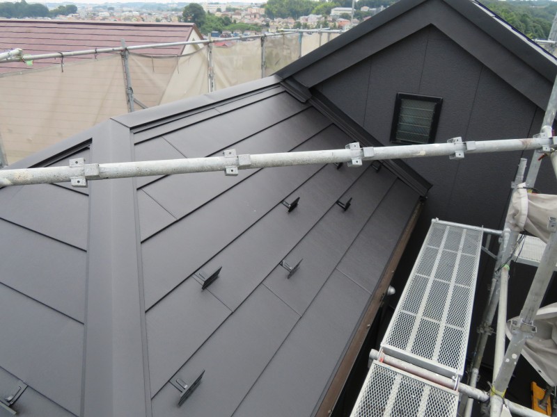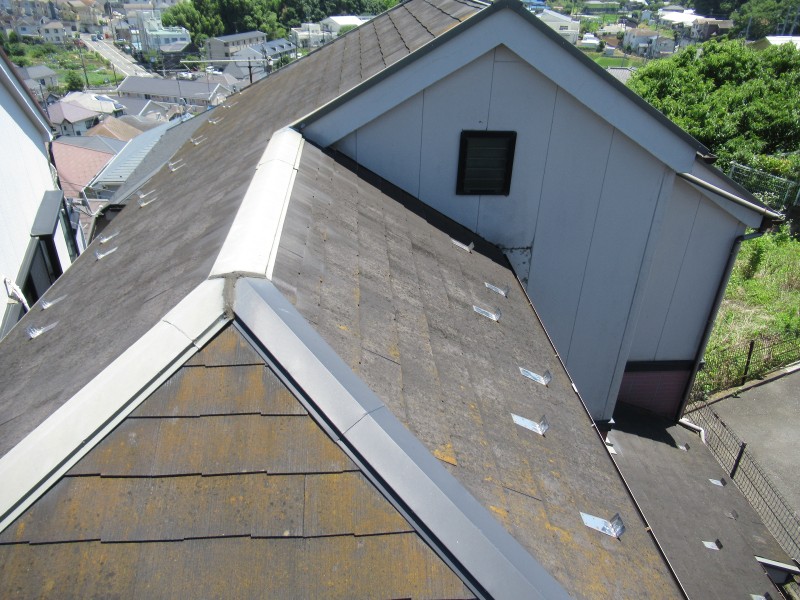 神奈川県横浜市 屋根葺き替え 通常まだ塗装で間に合う年数でしたが、経年劣化以上の傷みがあり、特にコロニアルの剥離、反りがかなり見られ、現在の屋根材の上に軽量、高耐久なガルバリウム鋼板による葺き替え(カバー工法)をしました。