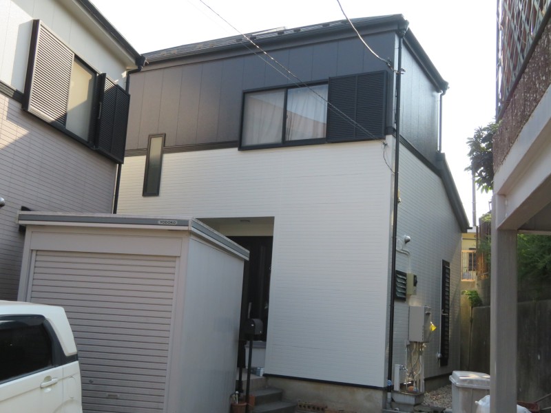 神奈川県横浜市 外壁:サイディングボード、屋根:コロニアル。 今回の施工は、外壁をツートンの超高耐久遮熱フッ素樹脂塗料で、屋根は高耐久遮熱塗料で仕上げました。外壁はメーカー保証(変退色、塗膜剥離)です。
